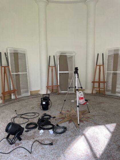 De tempel waar je nu in staat, werd in 1818 opgericht voor de meesterverheffing in de vrijmetselarij van baron Emmanuel Vanderlinden d’Hoogvorst. Dat intrigeerde An Vanderlinden. Ze deed onderzoek naar symbolen in de vrijmetselarij, en gebruikte ze als bouwstenen voor deze installatie. Zo is het allerminst toeval dat het net 7 schilderijen geworden zijn.