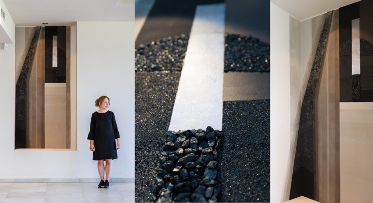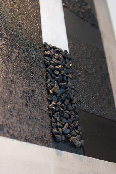 Het werk “Pedestal” of Voetstuk is een interpretatie van de voet van de authentieke mijnschacht van Eisden. Het werk is gerealiseerd met verf op basis van pigmenten verkregen door het vermalen van steenkool geraapt op de omliggende terrils. Verf die overgaat in het kostbare ruwe materiaal dat door de mijnwerkers is gedolven uit de ondergrond. Steenkool op een voetstuk, een werk als eerbetoon aan de mijnwerkers in de schaduw van de koninginnenschacht.